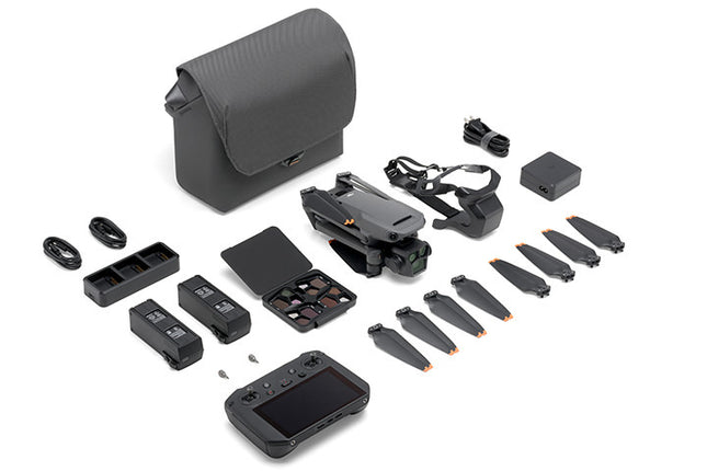 DJI Mavic 3 Pro × 1DJI RC × 1DJI RC Control Sticks (Pair) × 1DJI Mavic 3 Intelligent Flight Battery × 3DJI Mavic 3 Low-Noise Propellers (Pair) × 6DJI 100W USB-C Power Adapter AC Power Cable × 1DJI 100W USB-C Power Adapter × 1USB-C to USB-C Cable × 2DJI Mavic 3 Battery Charging Hub (100W) × 1DJI Mavic 3 Pro Storage Cover × 1DJI Mavic 3 Pro ND Filters Set (ND8/16/32/64) × 1DJI Shoulder Bag × 1