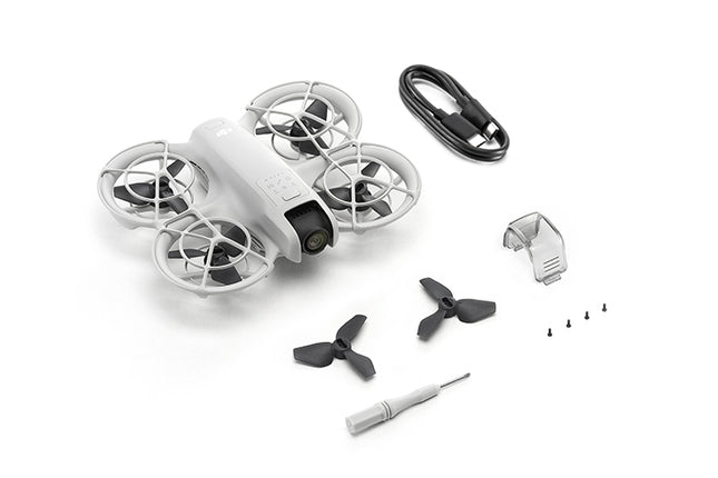DJI Neo Aircraft × 1DJI Neo Intelligent Flight Battery × 1DJI Neo Propeller Guard (Pair) × 1DJI Neo Spare Propellers (Pair) × 1DJI Neo Spare Propeller Screw × 4Screwdriver × 1DJI Neo Gimbal Protector × 1Type-C to Type-C PD Cable × 1Documents (Quick Start Guide, Safety Guidelines, and DJI Logo Stickers) × 1