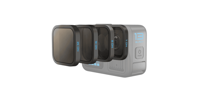 4 smart ND Filters for motion blur Attach one of these premium HB-Series neutral density (ND) filters, and your HERO13 Black automatically detects it and shifts into Auto Cinematic video mode so you can create motion blur with ease. Advanced users can select the Auto 180° shutter setting, or manually configure the shutter speed and exposure settings to fine-tune a shot for the lighting conditions. Made from scratch-resistant, high-optical quality glass and waterproof when installed. Product Details Includes ND4, ND8, ND16 and ND32 filters, protective filter cap, protective filter case and microfiber lens cloth 4 filters let you choose the one that works best for your activity and lighting conditions Auto Cinematic video mode makes it easy for first-time ND filter users to produce shots with motion blur Experienced ND filter users can manually configure exposure settings to get their perfect amount of motion blur HERO13 Black automatically detects each filter when attached and makes filter selection easy by suggesting the best filter for the shot based on lighting conditions Scratch-resistant and waterproof when mounted on the camera, with hydrophobic lens coatings that repels water Easy to attach, with no tools needed Part of the high-performance HB-Series Lens collection—exclusively for HERO13 Black Tip: start with the ND4 filter for low light/late sunset filming, ND8 for golden or blue hour filming, ND16 for afternoon filming, and ND32 for bright and sunny daytime shooting Includes GoPro’s Limited Lifetime Warranty GET DRAMATIC MOTION BLUR WITH EASE This 4-pack of neutral density filters includes ND4, ND8, ND16 and ND32 filters, made from high optical quality glass for super easy and precise exposure control. They cover a wide range of conditions—and will even suggest when you need to go up or down a stop depending on your current lighting environment. AUTO-DETECT INSTANTLY TRANSFORMS YOUR CAMERA The lenses automatically put you in the right mode with the right settings for the shots you want. GET THE RIGHT EXPOSURE AUTOMATICALLY First time using ND filters? No worries — with Auto Cinematic Mode, the camera automatically adjusts the shutter to capture motion blur with optimized stabilization. You’ll get the dramatic effect you want with maximum ease.¹ OR CONTROL THE MANUAL EXPOSURE MANUALLY Know what kind of look you want? Select your desired level of motion blur—from an amount that’s optimized for stabilization, to the Auto 180° shutter setting—or configure the shutter speed and exposure manually.