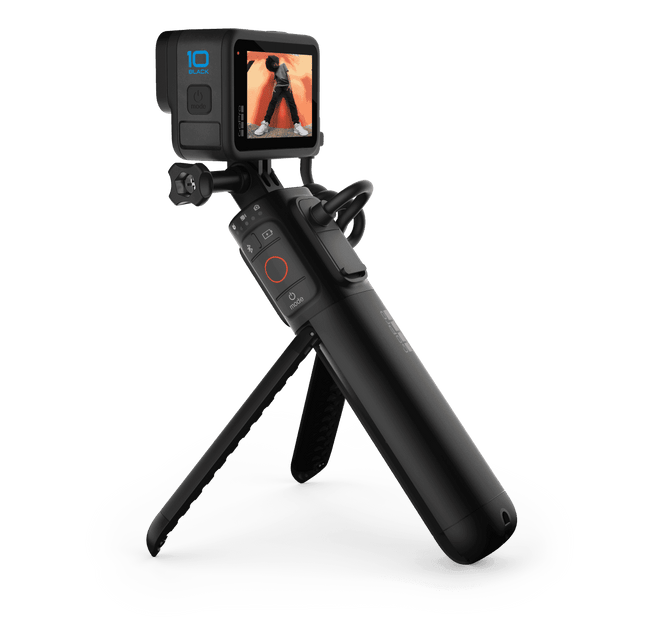 The power to GoPro all day. Ultra versatile by design, Volta is a premium battery grip and a whole lot more. It combines with the standard GoPro battery to deliver over 4 hours of 5.3K recording—a total of 3x the normal runtime.¹ It also features built-in buttons for easy one-handed camera control, can also be used as a wireless camera remote and has flip-out legs that transform it into a handy tripod. Product Description Product Details Built-in battery provides over four hours of 5.3K/30 recording time¹ Integrated camera buttons for easy one-handed control Built-in tripod legs flip out for stable shots Wirelessly controls camera from up to 98 ft (30m) away² Weather-resistant design Status lights for battery life + camera mode Compatible with GoPro Mods + Accessories Mounting fingers rotate and tilt the camera Charges other USB-C devices Battery capacity: 4900 mAh Power input: 5V/3A (15W max) Power output: 5V/2.4A (12W max) Power input/output type: USB-C Charge time: 2.5 hours with GoPro Supercharger (sold separately) POWER. GRIP. TRIPOD. REMOTE. Get out. Stay out. Get all the shots. Extended Battery Power Powered grip combines with your camera’s battery for over 4 hours of 5.3K/30 recording time.¹ Single-Hand Control Integrated camera buttons for easy one-handed control. Built-in Tripod Flip out the tripod legs for time-lapse, a group photo or any other stable shot. Wireless Remote Detach the grip and control your camera from up to 98 ft away.² The super-versatile grip with special abilities. Finally, a grip that keeps up. Mod Compatible Connects with Media Mod to customize and expand. Mounting Fingers Fold out to attach to GoPro backpacks, straps and more. LED Lights Check battery life and camera mode at a glance. Integrated Camera Buttons Let you power on/off, start/stop capture and switch modes. Designed for everything you do. Made for the elements. Weather resistant and built to take a beating. WARNING: This product contains Nickel, which is known to the State of California to cause cancer and birth defects or other reproductive harm. For more information, go to P65Warnings.ca.gov. Warning: Volta is not waterproof. Using it underwater with your GoPro will damage your camera and void the warranty. ¹Total recording time based on recording 5.3K footage (average of 4 hours and 10 minutes total) at 30 frames per second using the combined power of a fully charged HERO10 Black standard battery and Volta battery grip at 77°F (25°C). Recording times may vary with camera settings and environmental conditions. ²Range may be affected when recording with higher resolutions and frame rates and other high-performance settings. Volta Compatibility Charge Wired Control Wireless Control Weather Resistant HERO10 Black H10 w/ Media Mod HERO9 Black H9 w/ Media Mod MAX * HERO8 Black * H8 w/ Media Mod * *Must setup Bluetooth connection as "The Remote"
